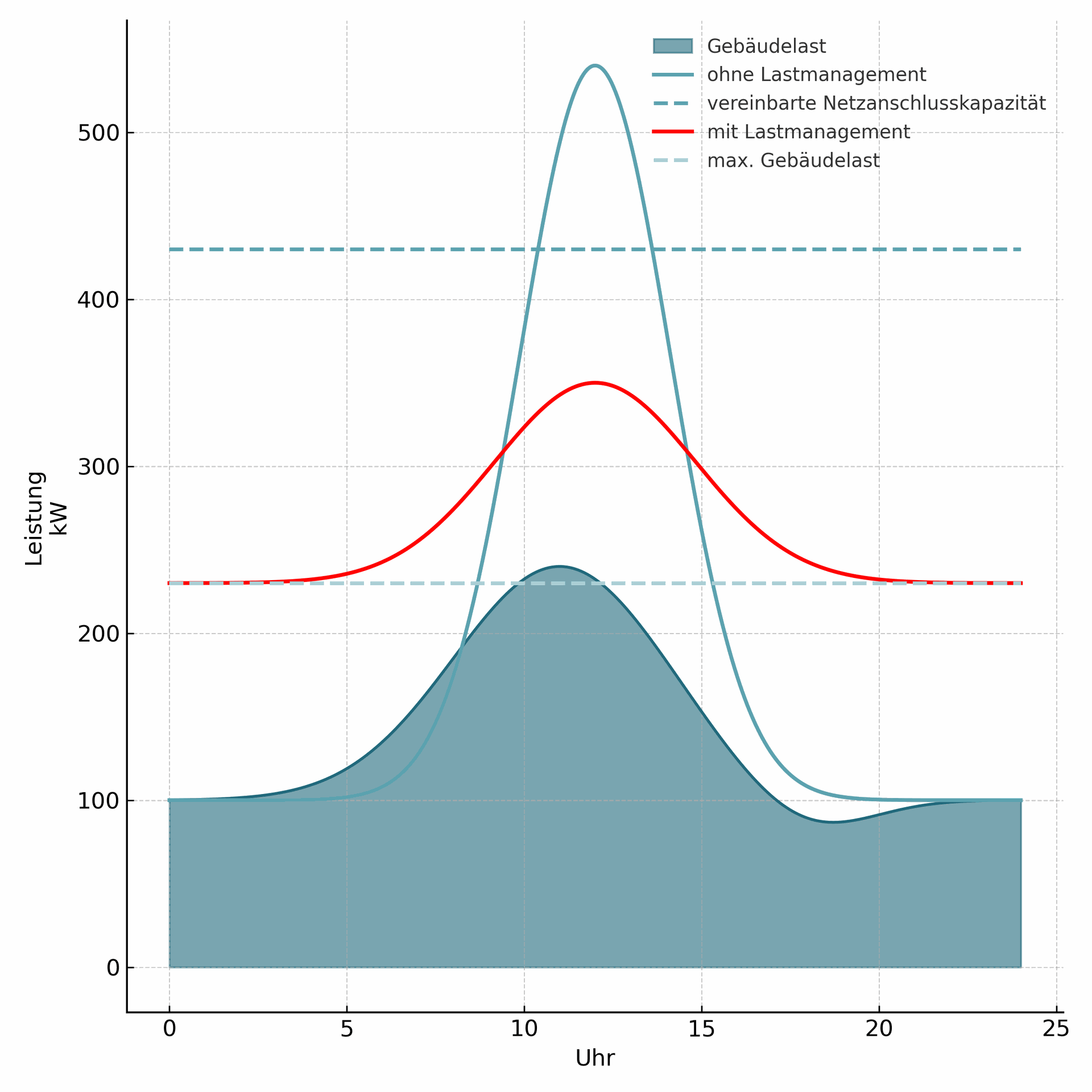 Vergleich der elektrischen Gesamtlast eines Gebäudes mit und ohne Lastmanagement über 24 Stunden. Die maximale Gebäudelast (dunkelblau) und die zusätzliche Ladeleistung ohne Lastmanagement (türkis) führen zu einer Überschreitung der vereinbarten Netzanschlusskapazität (gestrichelt türkis). Durch intelligentes Lastmanagement (rot) wird die Ladeleistung geglättet und die Kapazitätsgrenze eingehalten.